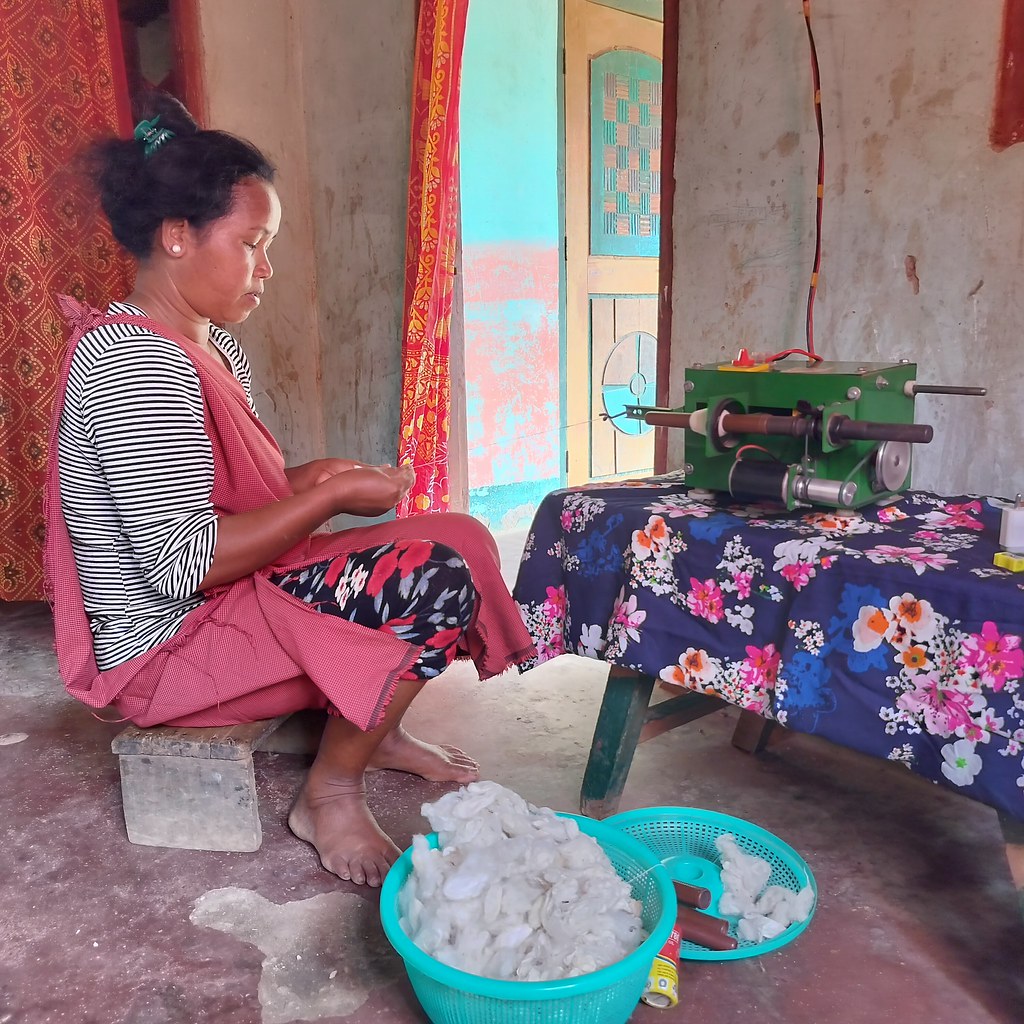 Warmawsaw, Meghalaya, Intia 14.4.25 (IPS) Intian Meghalayan osavaltion maaseutualueilla silkkitoukkien kasvatus on syvälle juurtunutta perinnettä. Silkkilangan kehruu ja kutominen ovat pääasiassa naisten tehtävänä. Yhä useampi nainen käyttää aurinkovoimalla toimivaa kehruukonetta silkkilangan tekemiseen.