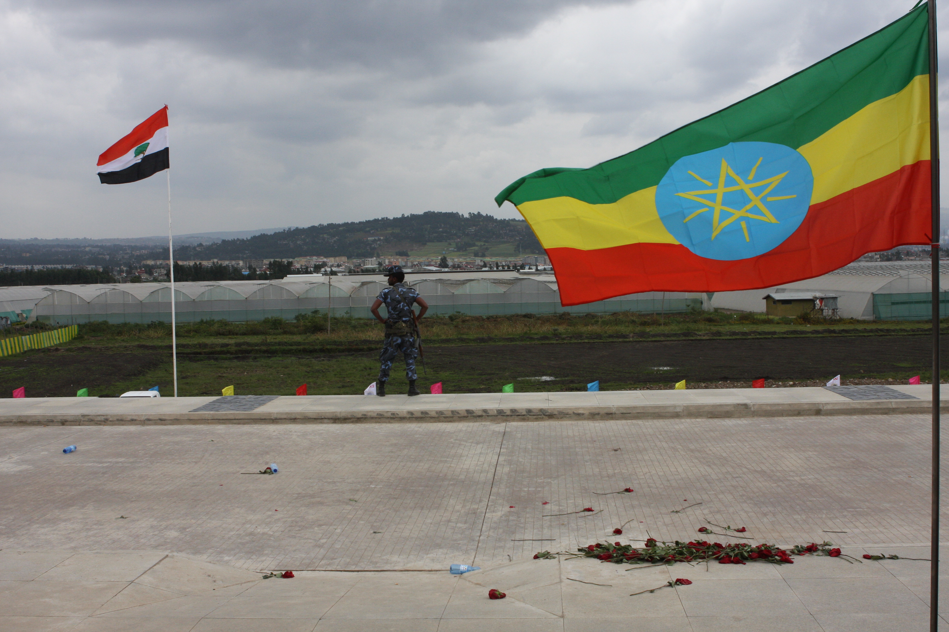 - Federal polis mellan flaggan för regionen Oromia (till vänster) och Etiopiens flagga vid en ceremoni när motorvägen mellan Addis Abeba och Djibouti invigdes i oktober 2016. Vägen har varit viktig för att stärka ekonomin men har samtidigt skapat en utbredd ilska bland många etiopier som menar att deras liv inte har blivit bättre trots fanfarer och tillkännagivanden. Foto: James Jeffrey/IPS