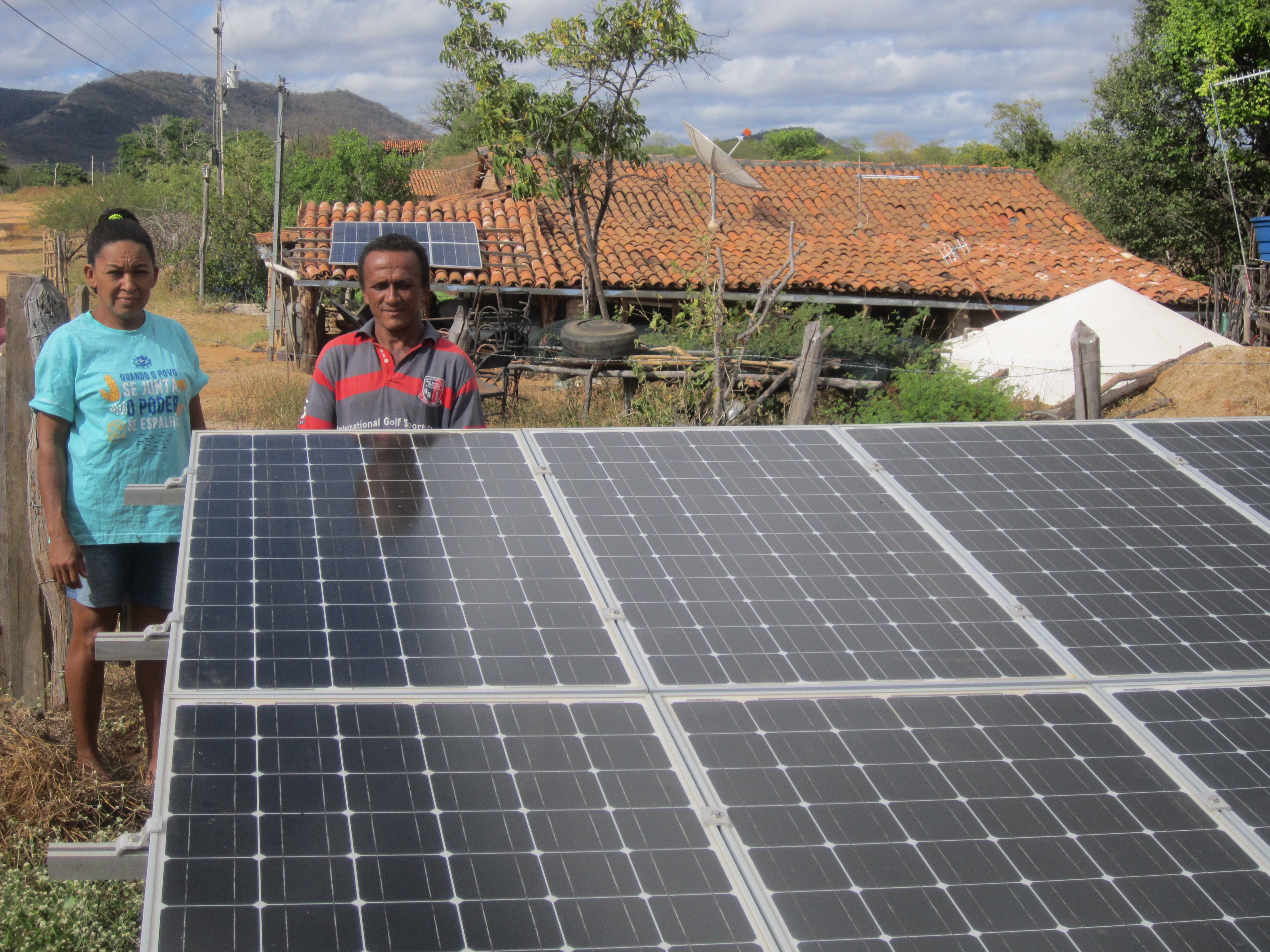 - De lokala bönderna Marlene och Genival Lopes dos Santos bredvid de solpaneler som installerats gemensamt av lokalbefolkningen i närheten av Sousa. Foto: Mario Osava/IPS