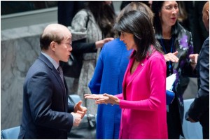 Nikki Haley, the American ambassador to the UN, with Liu Jieyi, China’s ambassador, before the April 18 Security Council meeting focused solely on human rights. Credit: Rick Bajornas /UN Photo