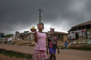 Infrastructure across Liberia, including electricity installations, was destroyed during the country's protracted civil war (1989-2003). Above, girls in the town of Totota in Bong County walk past homes that are being demolished as the government rebuilds roadways. Photo: UN Women