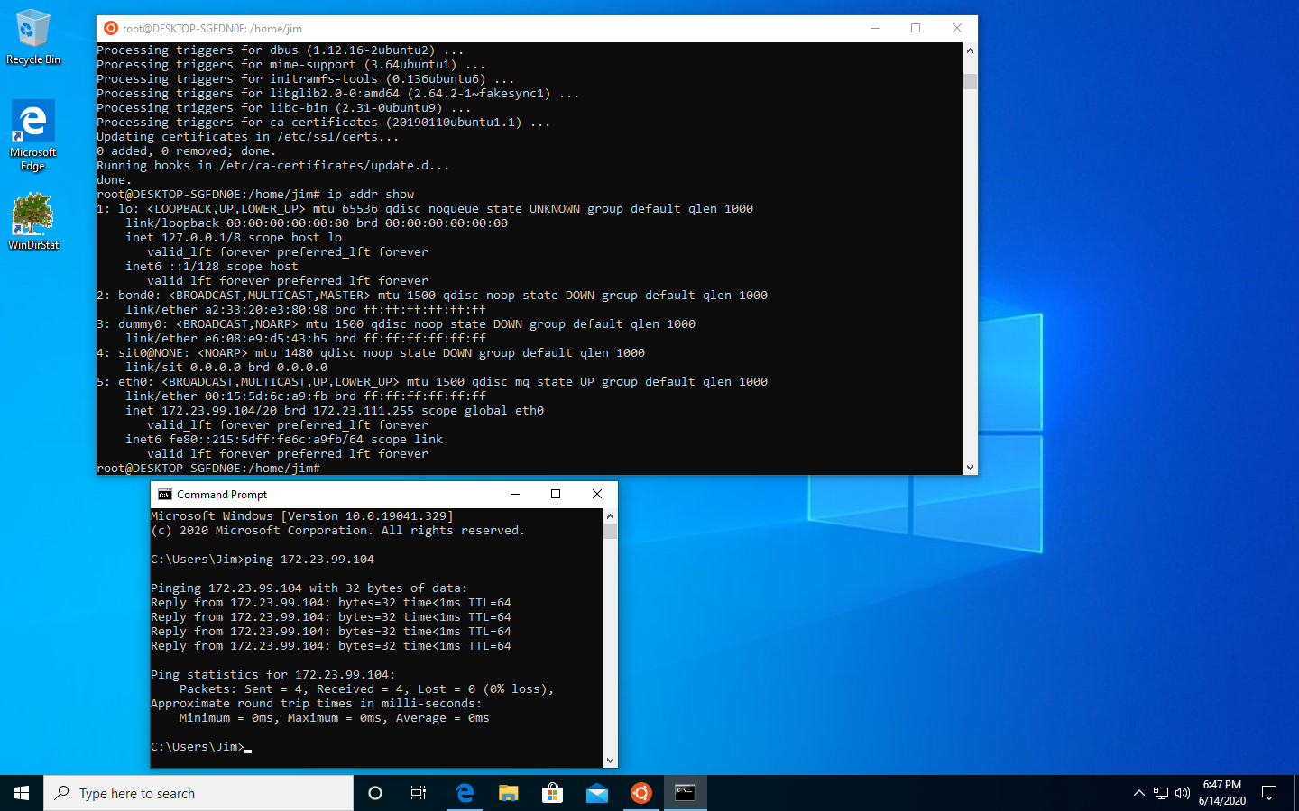 This makes things a little painful in terms of your own Windows 10 PC accessing network services on your WSL2 VM—after all, it may not get the same virtual IP address every time it’s booted—but at least your Windows 10 PC can access the WSL2 VM’s network ports directly (as shown in the screenshot above). If you know the VM’s internal IP address, you can ping it or access any TCP or UDP ports on it at will.