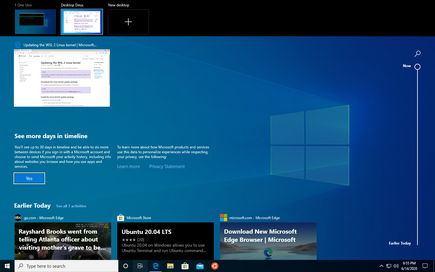 Windows 10 began previewing Linux-style Virtual Desktops in March 2019, and it made them generally available beginning with last Fall’s Build 1909. For those who aren’t familiar, Virtual Desktops give users a way to separate applications into functional groups with less clutter. For example, you might have Photoshop, Lightroom, and an instance of Edgium open to a stock images site on one virtual desktop, and your email, a company intranet site, and an instance of Teams open on another.