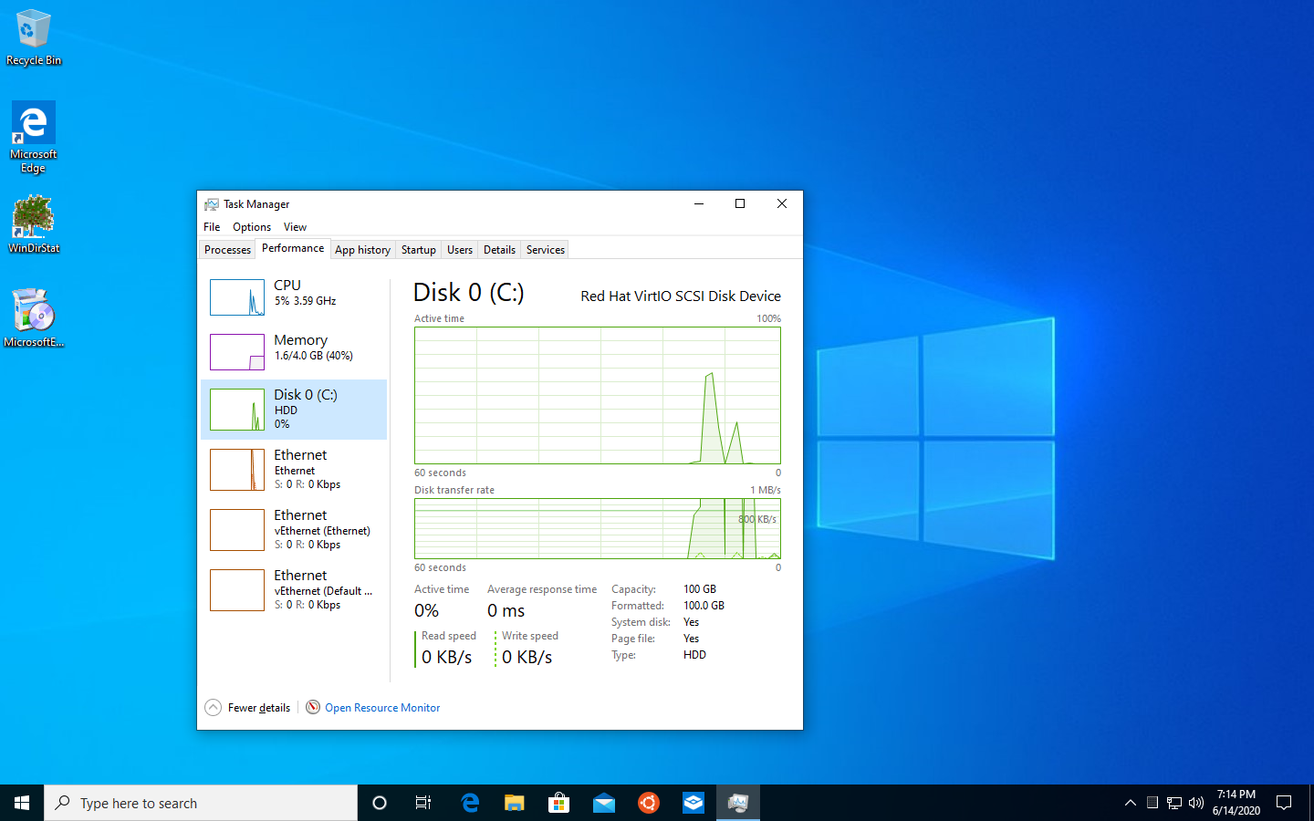 Finally, Task Manager gets a couple of minor but welcome visual updates—when selecting any disk under the Performance tab, the make and model of that disk is displayed along with its logical address, drive letter, and performance data. For example, we’re running Windows 10 Build 2004 in a virtual machine under Ubuntu, so our C: drive shows up as “Red Hat VirtIO SCSI Disk Device.” In systems with a dedicated GPU, that GPU’s temperature is also visible on the Performance tab.