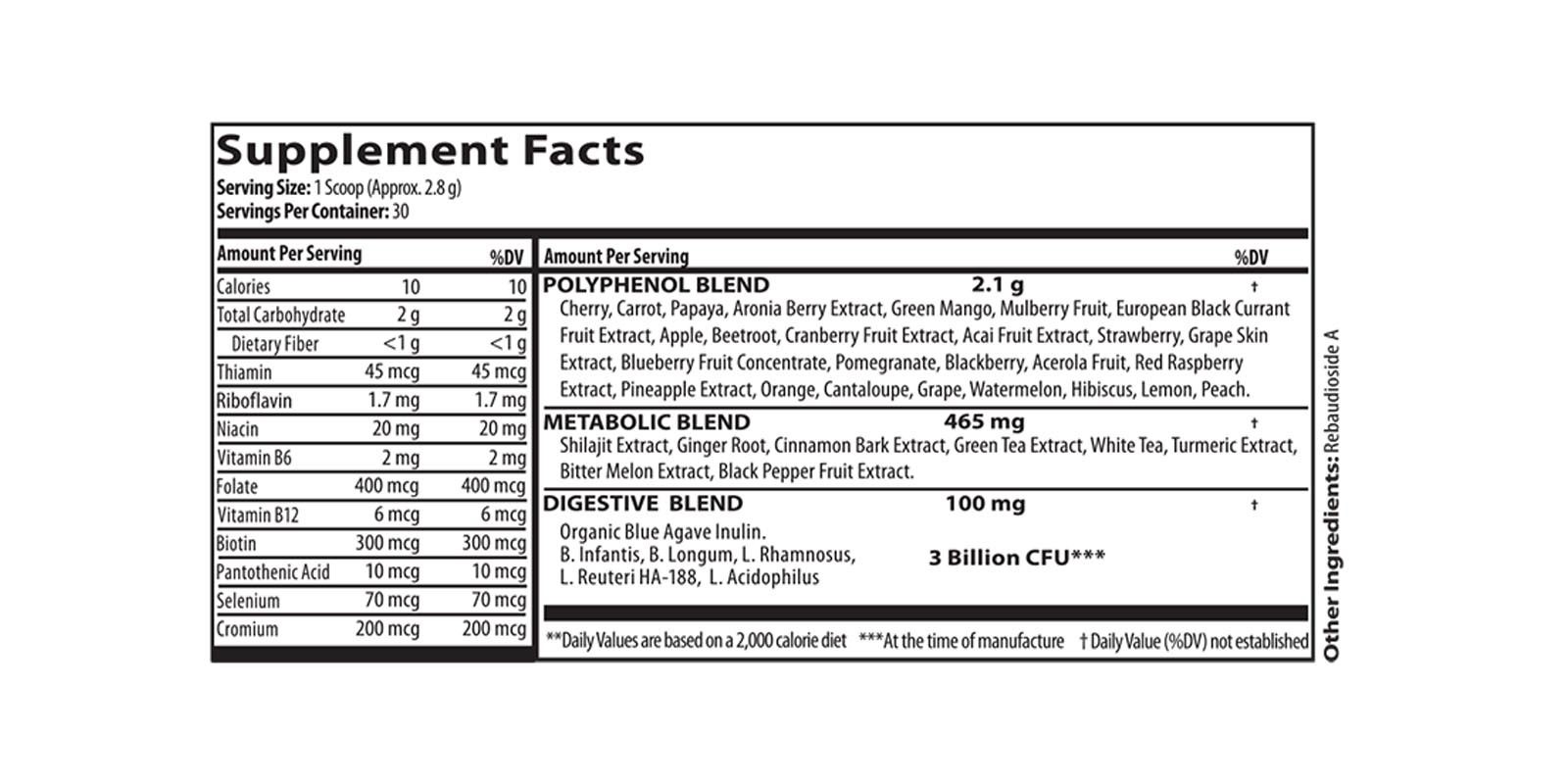 Ingredients Polyphenol Blend, Metabolic Blend, Digestive Blend, Other Ingredients