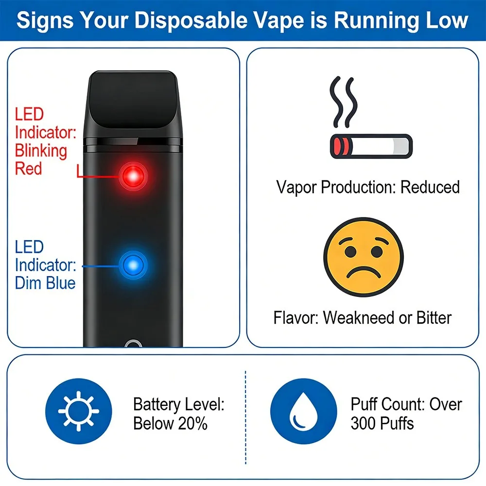 Knowing when your disposable vape is almost empty comes down to paying attention to a handful of simple signals: the taste, the vapor volume, the LED behavior, and how the hit feels. Once you get familiar with these signs, you will never be caught off guard by a dead device again.