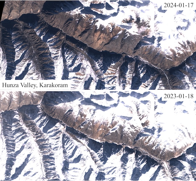 Une image satellite de la vallée de Hunza montre les différences entre les chutes de neige de l’hiver dernier et celles de cet hiver. Crédit : ICIMOD