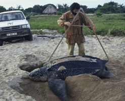 While several species of sea turtle are taken for food, the giant leatherback turtle is said to be the most threatened as they are accidentally caught and killed in long line fisheries. It is currently identified as 'critically endangered' and many scientists fear that unless threats to these animals are negated, they could suffer the same fate as the white dolphins.