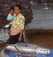 A woman with an unexploded shell that landed in her home in Vakari village, Batticaloa Credit: Sanjaya Nallaperuma/IPS