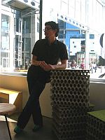 The Peruvian Tijuana-based architect Giacomo Castagnola designed two rooms where patrons can learn more about sustainable design. The furniture used in the exhibitions lounge was composed of egg crates and recycled paper. "It's about creating a space that's sustainable," he said.