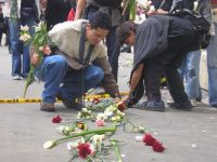 René Guarín and other relatives of victims cover with flowers the last stretch of street that their loved ones walked across alive. Credit: Adriana Cuéllar/IPS