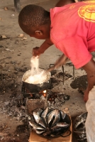 Congolese farmer cooking maize porridge and fish - changing rainfall patterns threaten production of staple foods. Credit: Miriam Mannak/IPS