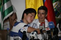 Alan Jara hugs his son at Tuesday's press conference. Credit: Constantino Castelblanco/Gobernación del Meta