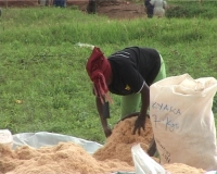 Dust fills the air as women fill white polythene bags with dry powder made from papyrus reeds, ready for weighing. The refugees are engaged in a project run by the United Nations High Commission for Refugees (UNHCR) to make thousands of refugees in Uganda and beyond producers who are able to at least partially support themselves despite their displacement.