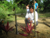 His grave reflects the poverty of this jungle community: he lies beneath a patch of earth marked by a simple white-painted wooden cross, surrounded by flowers.