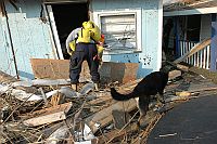 A search and rescue worker and his canine partner enter a damaged house to search for victims of Hurricane Katrina on Sep. 3, 2005. Credit: US Govt