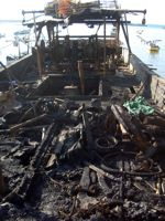 A charred hole on the front right-hand side of the boat marks where the mortar hit and exited. From that point down, the deck is blackened with soot. The metal steering wheel is all that remains of the cabin.