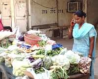 A door-to-door vegetable vendor uses her mobile phone to increase her earnings. Credit: Ranjit Devraj