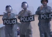 DynCorp mentor watches Afghan National Police practice riot control tactics at the Kabul Central Training Centre. Credit: Ronald Nobu Sakamoto
