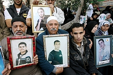 Families of Palestinians prisoners hold up their pictures at a protest in Gaza city. Credit: Mohammed Omer/IPS