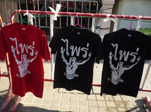 Shirts on sale at the protest site in Bangkok say 'prai', which refers to the low and uncouth 'commoners'. Credit: Johanna Son/IPS