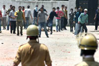 An angry mob of youth protesters throw stones at police forces in the disputed Kashmir region. Credit: Athar Parvaiz/IPS