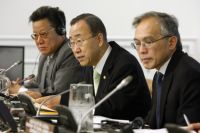 Secretary-General Ban Ki-moon addresses the ECOSOC High-Level Segment, flanked by Sha Zukang (left) and Hamidon Ali. Credit: UN Photo/Eskinder Debebe