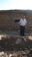 Holding shrapnel in his hand, a local Kurd inspects bomb damage near a civilian house in Serkhan village, northern Iraq. Credit: Jake Hess