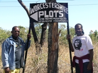 Zimbabwean war veterans hold a make-shift sign directing people to their seized farm plots. Credit: Fidelis Zvomuya/IPS