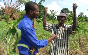 Ambroise Pierre shows a reporter how strong and tall his corn, grown from his own seed, stands. Credit: Courtesy of Haiti Grassroots Watch