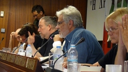 From right to left: retired U.S. army colonel Ann Wright, Vangelis Pissias and Dror Feiler. Credit: Bego Astigarraga/IPS