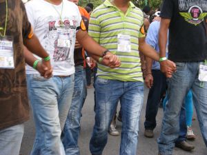 The delegation from Catatumbo, on the border with Venezuela, stayed together as a group and had their own guard. Credit: Constanza Vieira/IPS