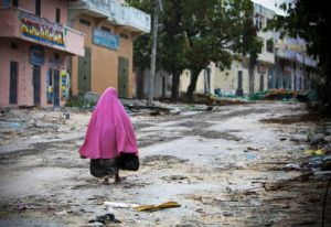 A woman walks through the deserted streets of Bakara Market in Mogadishu, until a few days ago a strategic stronghold of Al-Shabaab. Credit: UN Photo/Stuart Price