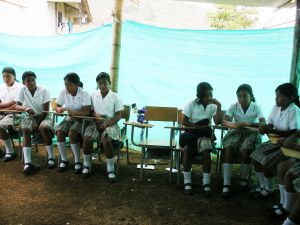 Vanesa’s classroom has a dirt floor and green plastic sheeting instead of walls. Her empty desk holds a purple ribbon, two withered roses, a prayer card with the image of Jesus, a rosary and candy that the children share with Vanesa to cheer up her spirit, in keeping with Nasa beliefs.