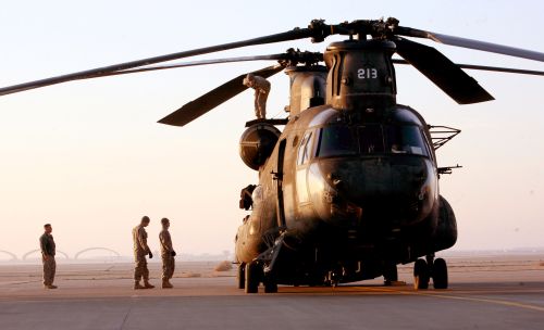 U.S. Army soldiers examine their CH-47 Chinook helicopter before an aircraft turnover mission at Al Asad Air Base, Iraq. Credit: DoD photo
