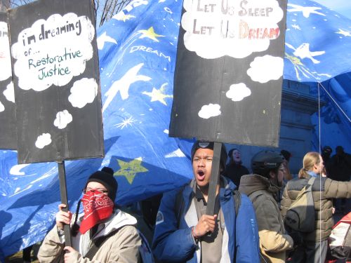 Gathered at McPherson Square in Washington, most were unfazed by the National Park Service’s intention to enforce a “no camping” rule starting at noon on Monday. The occupiers gathered under a “Tent of Dreams”, a blue tarp over a statue, to showcase solidarity and waved slogans that read “Eviction? Bring it!”