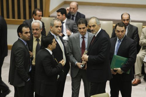 Syrian ambassador Bashar Ja’afari (front, right) inside the Security Council Chamber before the Feb. 4 vote. Credit: UN Photo/Paulo Filgueiras