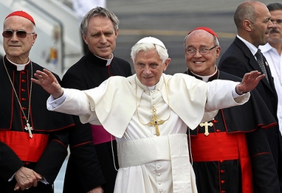 Pope Benedict at Havana airport, flanked by Vatican Secretary of State Tarcisio Bertone (left) and Havana archbishop Jaime Ortega (right). Credit: Jorge Luis Baños/IPS