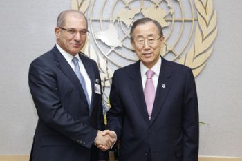 UN chief Ban Ki-moon (right) meets with Ahmet Üzümcü, director-general of the Organisation for the Prohibition of Chemical Weapons, on Feb. 29. Credit: UN Photo/Paulo Filgueiras