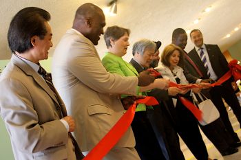 Helen Clark and John Ashe are joined by representatives from Japan, South Africa, India, Brazil and South Korea at the ribbon-cutting ceremony of the South-South Cooperation exhibition. Credit: Shari Nijman/IPS