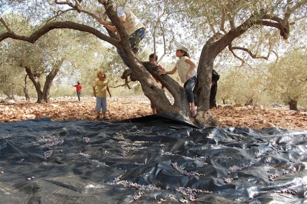 Palestinian children join in to make use of limited time given by the Israelis for gathering olives in Deir Istiya village in the occupied West Bank. Credit: Jillian Kestler-D’Amours/IPS.