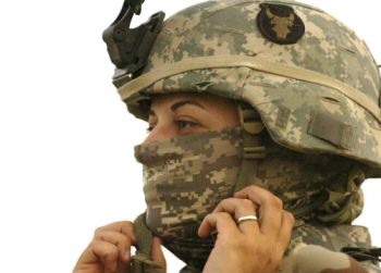 A Soldier with the Minnesota National Guard’s 1/34th Brigade Combat Team buttons her chin strap before heading out on a mission May 13 in Iraq.