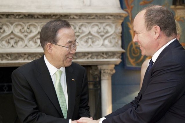 Secretary-General Ban Ki-moon (left) meets with Prince Albert II, Sovereign Prince of Monaco, at the Prince’s Palace in Monaco-Ville on Apr. 3, 2013. Credit: UN Photo/Rick Bajornas