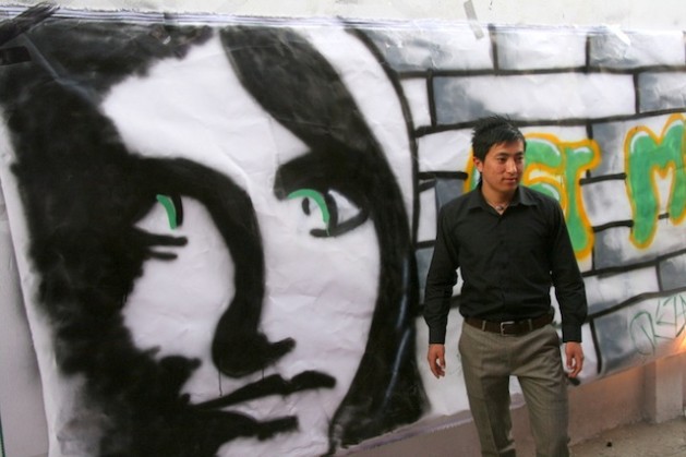 Young Afghan posing in front of one of the graffiti works of artist Reza Amiri. Credit: Giuliano Battiston/IPS