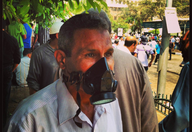 Saeed wears a gas mask outside a mosque in Cairo in anticipation of a police gas attack. Credit: Sam Kimball/IPS.