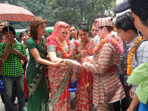 U.S. lesbian couple Courtney Mitchell (R) and Sarah Welton (L) getting married in Nepal under the aegis of the Blue Diamond Society, an LGBT rights organisation. Credit: Sudeshna Sarkar/IPS