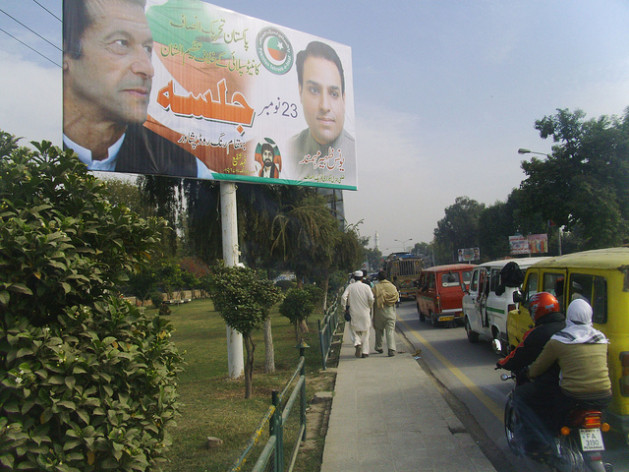 Posters and billboards have been posted by Pakistan Tehreek Insaf workers on University Road in Peshawar to urge people to attend their Nov. 23 anti-drone protest. Credit: Ashfaq Yusufzai/IPS