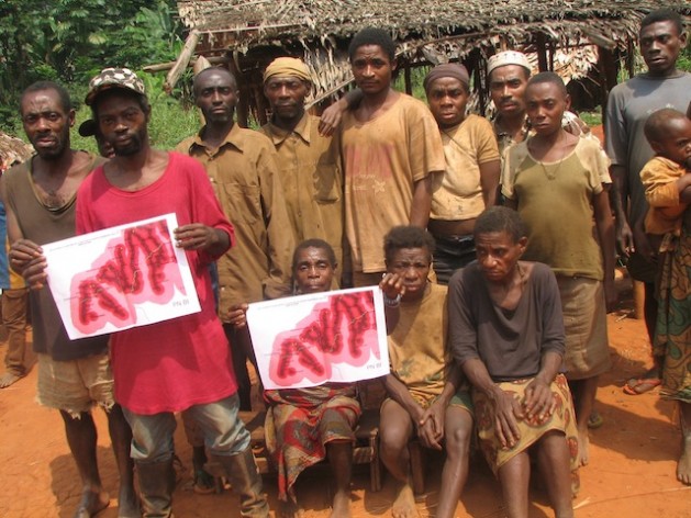 Baka from Ngoyla, near Cameroon’s Nki National Park, hold up a map of the forest. The dark red areas are those they have been restricted from entering which are of social, economic and cultural interest to them. Credit: Ngala Killian Chimtom/IPS