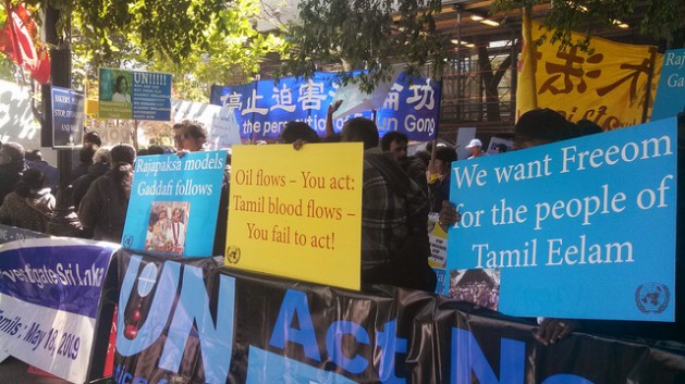 Tamils protest Sri Lankan President Mahinda Rajapaksa's speech at the U.N. General Assembly, Sept. 24, 2013. Credit: Samuel Oakford/IPS