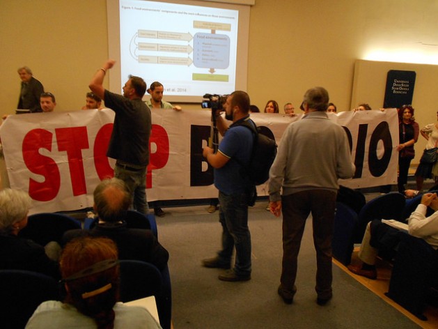 A dozen activists from the Stop Biocidio organisation disrupted Greenaccord’s 11th forum on Saturday Oct. 11 to demand that the Italian government clean up illegal toxic waste dumped on their lands and protect agricultural production around Naples. Credit: Emilio Godoy/IPS